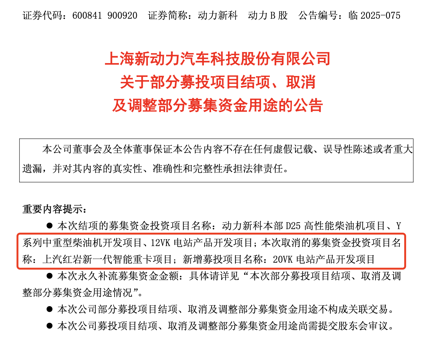 此外,动力新科同日宣布,将部分原计划用于上汽红岩“智慧工厂”项目的节余资金,变更用于公司自有的“20VK电站产品开发项目”。上述议案尚需提交股东大会审议。