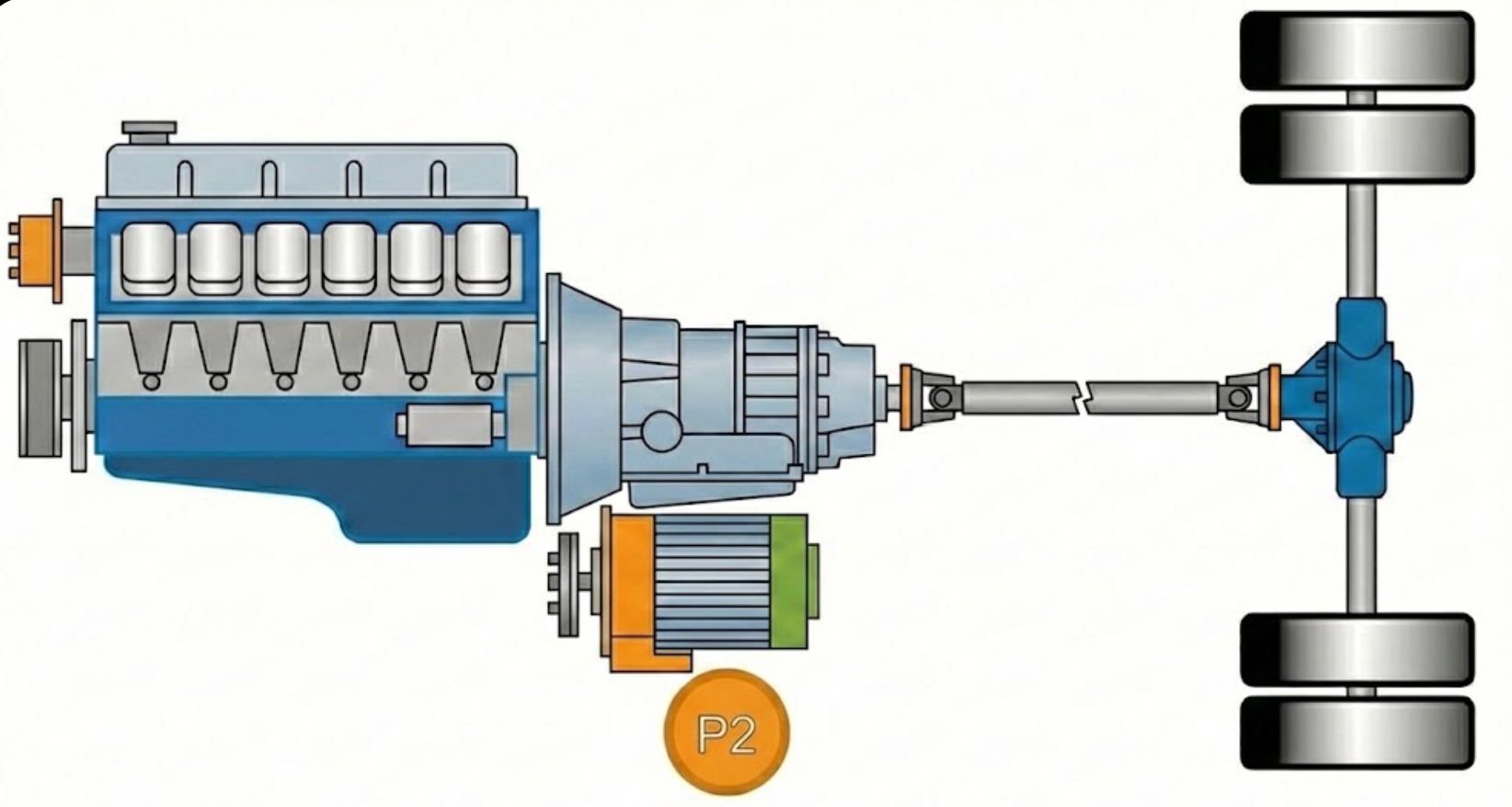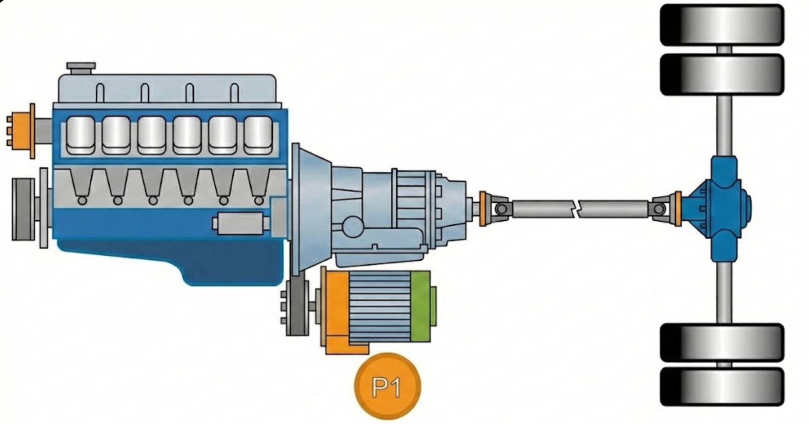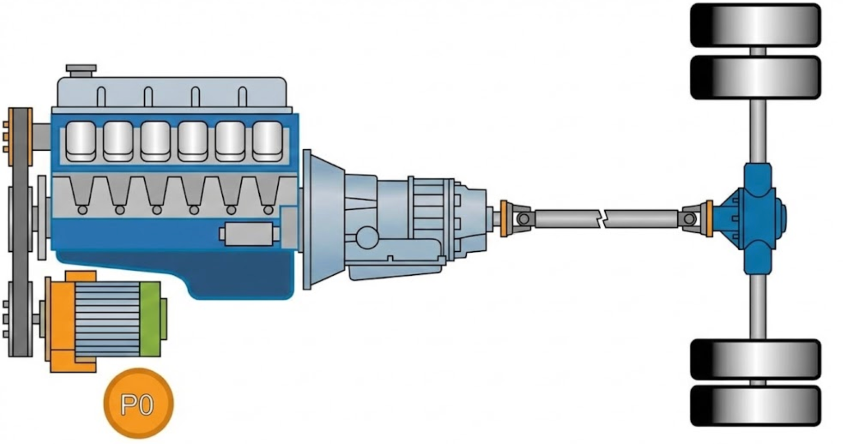 这是混动界的“入门级”方案。在乘用车上,如早期的奔驰C级48V轻混,P0很常见。但在重卡领域,P0架构几乎绝迹。原因很简单,皮带传动承受不了重卡的扭矩。