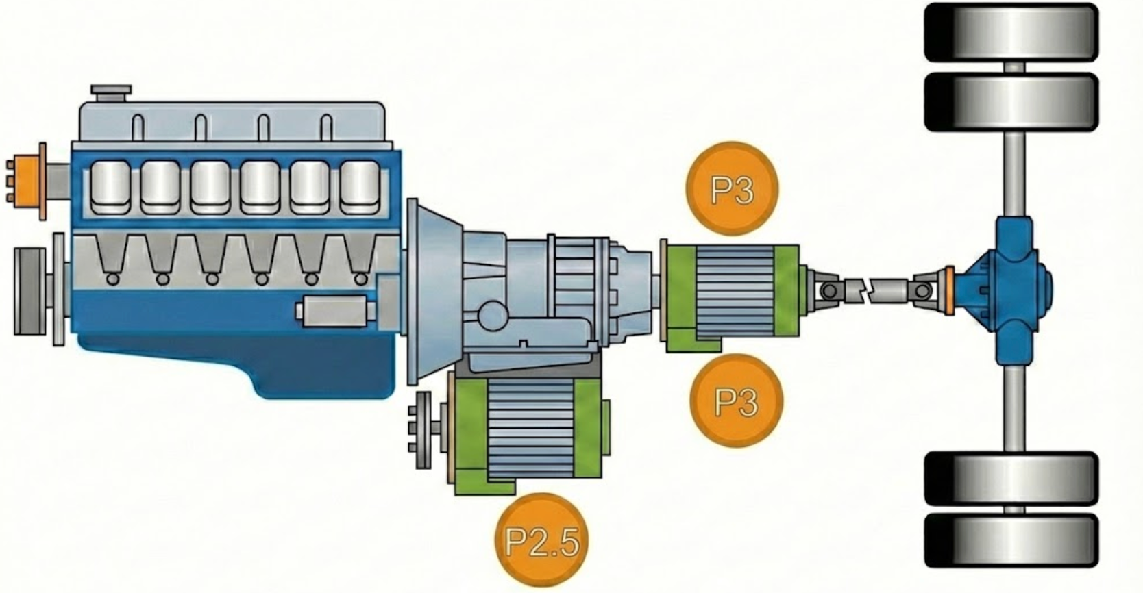 P2.5:电机整合在变速箱内部,多见于双离合变速箱,重卡少见。