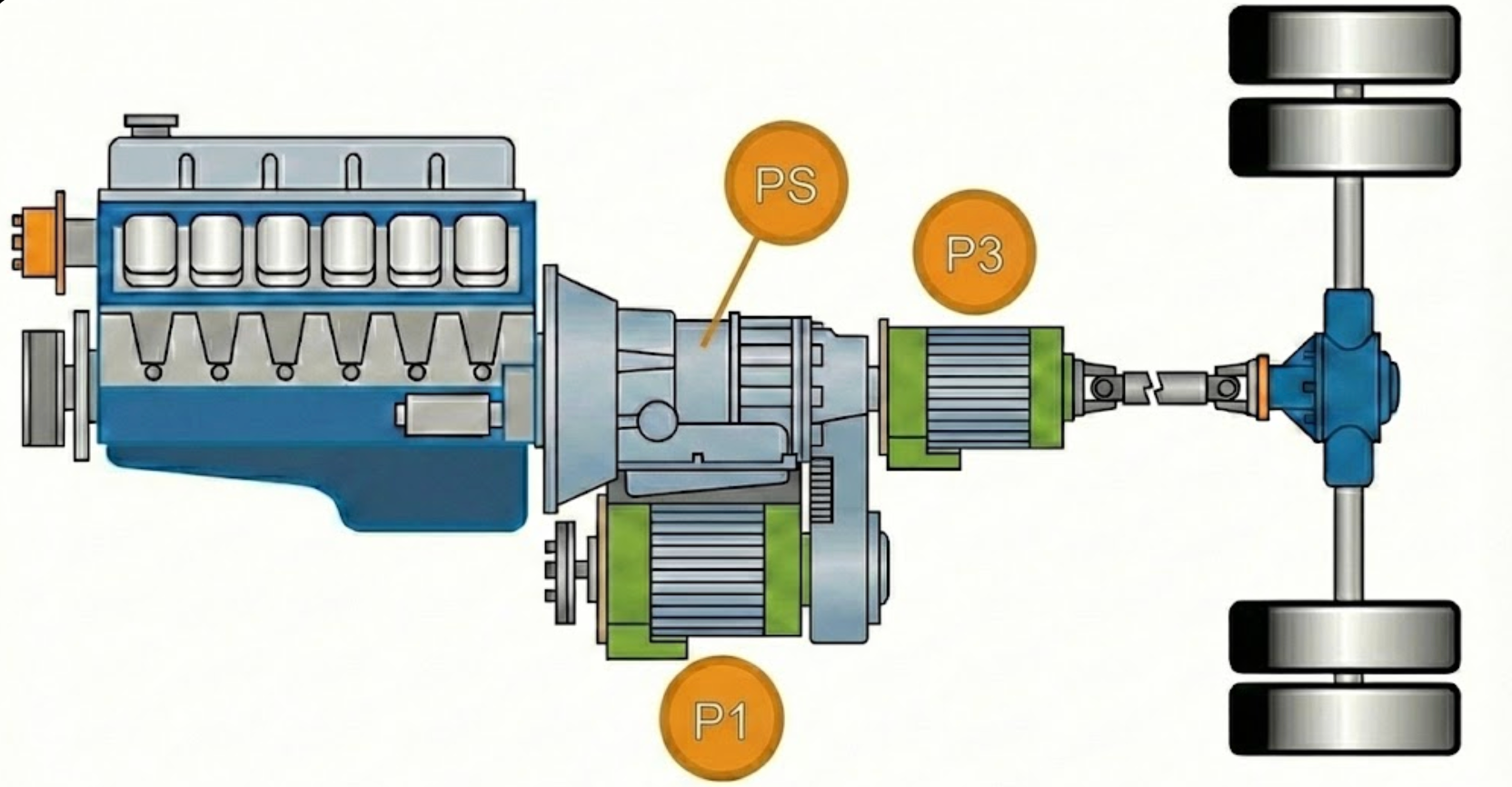 单纯的P3重卡几乎不存在。P3通常是作为“双电机系统”中的一部分出现的(见下文P1+P3)。