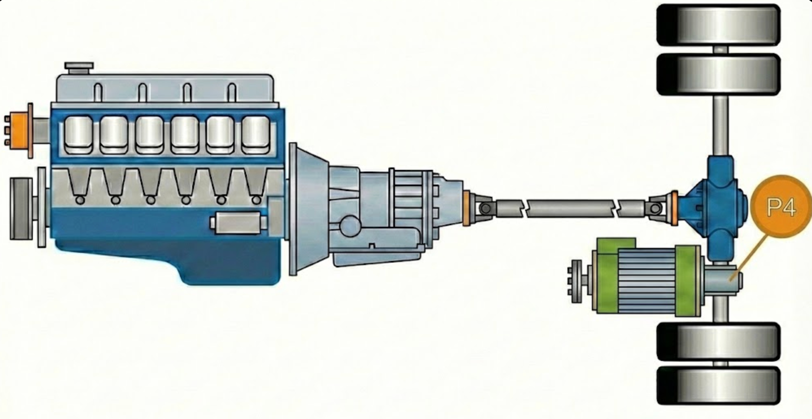 例如:前桥是柴油机驱动,后桥加装一个P4电驱桥。这样就构成了通过地面的“电四驱”。