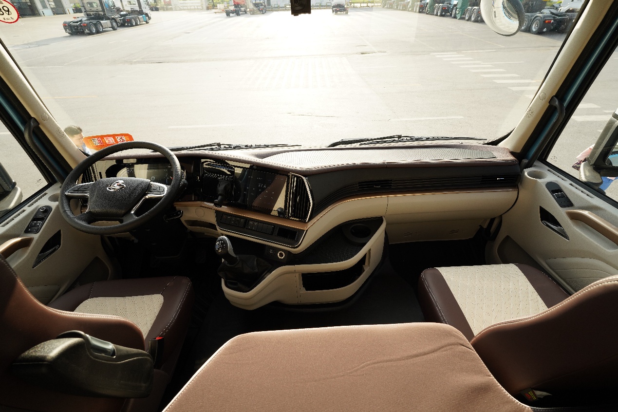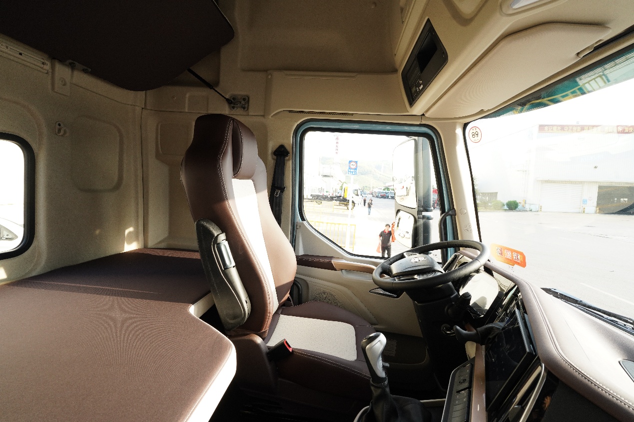 车辆配备的92公分超宽卧铺,充分考虑了双驾驶员运营场景下的休息需求。同时,皮质气囊座椅、气囊驾驶室悬置以及AMT变速箱的搭载,共同构建了能够有效缓解驾驶疲劳的舒适环境,使长途行车更为轻松。