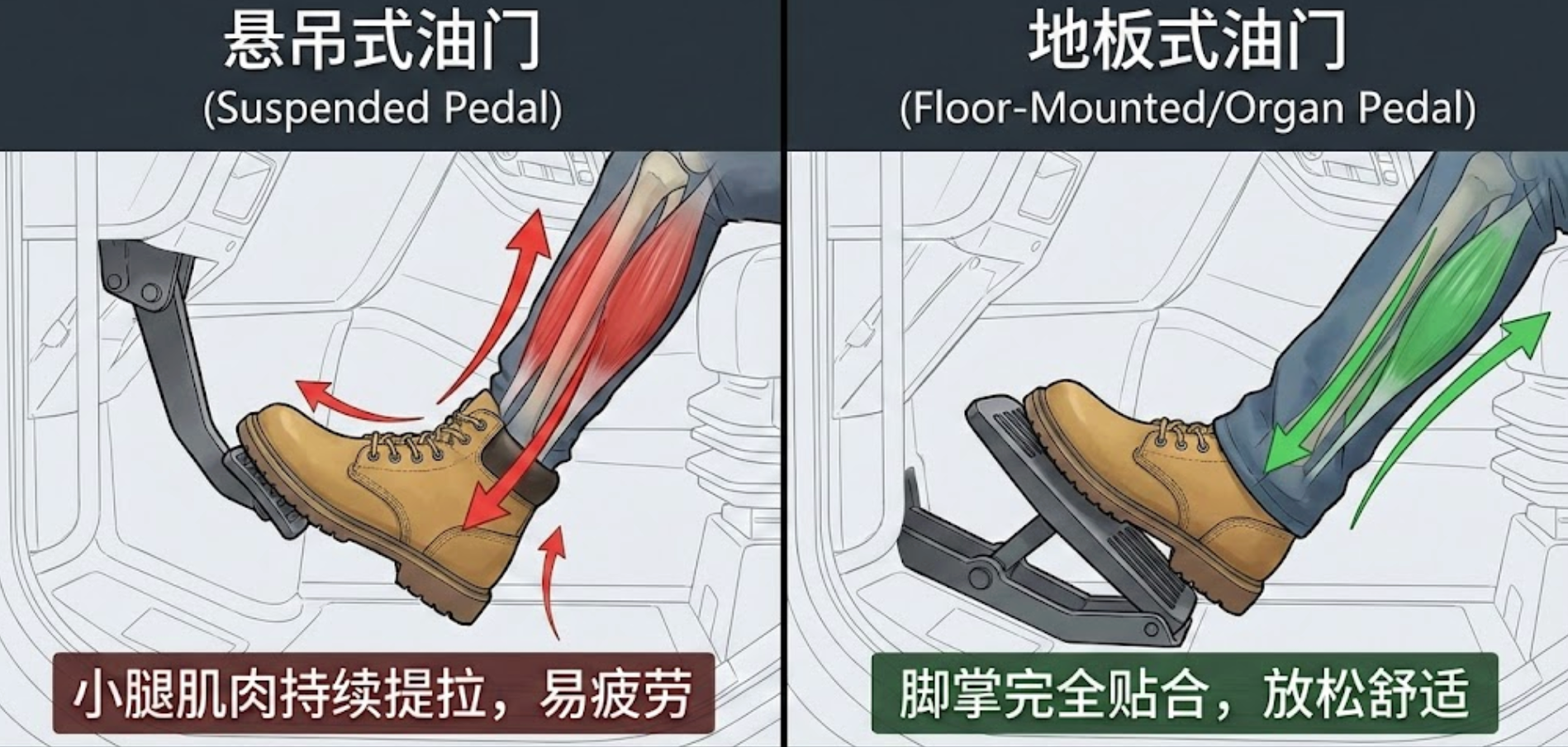今天我们就来硬核科普一下,重卡驾驶室里这个最不起眼、却被踩得最多的部件:悬吊式油门与地板式油门,到底暗藏了怎样的人机工程学差异。