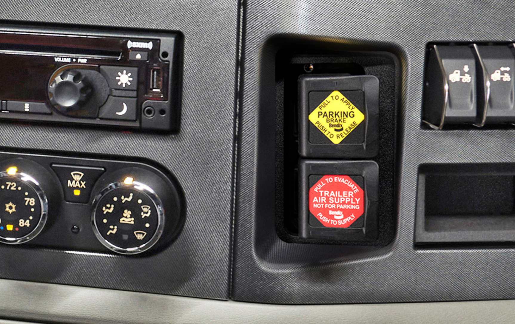 现在的旗舰重卡内饰越来越像豪华轿车,主副驾之间的地板越来越平整。为了腾出空间,那个陪伴了卡车司机几十年的、粗壮的机械断气刹手柄,正被一个带有“P”字样的精致电子按键所取代。