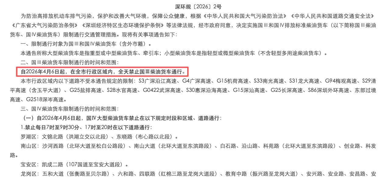 3月5日,深圳市相关部门正式发布《关于加强国三及以下排放标准柴油货车限行管理的通告》。这份被称为最严限行令的文件,明确给出了老旧车辆的生存倒计时。从下个月开始,一部分卡友的生计工具将彻底失去进城资格。