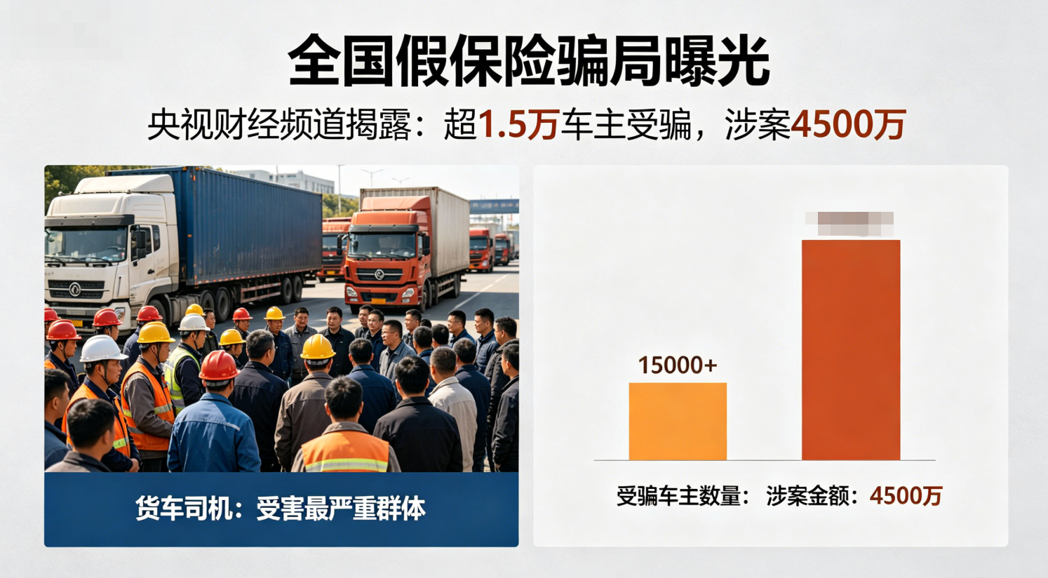 这不是段子,而是2026年4月,真实发生在一万多名货车司机身上的噩梦。近日,央视财经频道曝光了一起席卷全国的假保险骗局:超过1.5万名车主上当,涉案金额高达4500万,其中货车司机是受害最严重的群体。