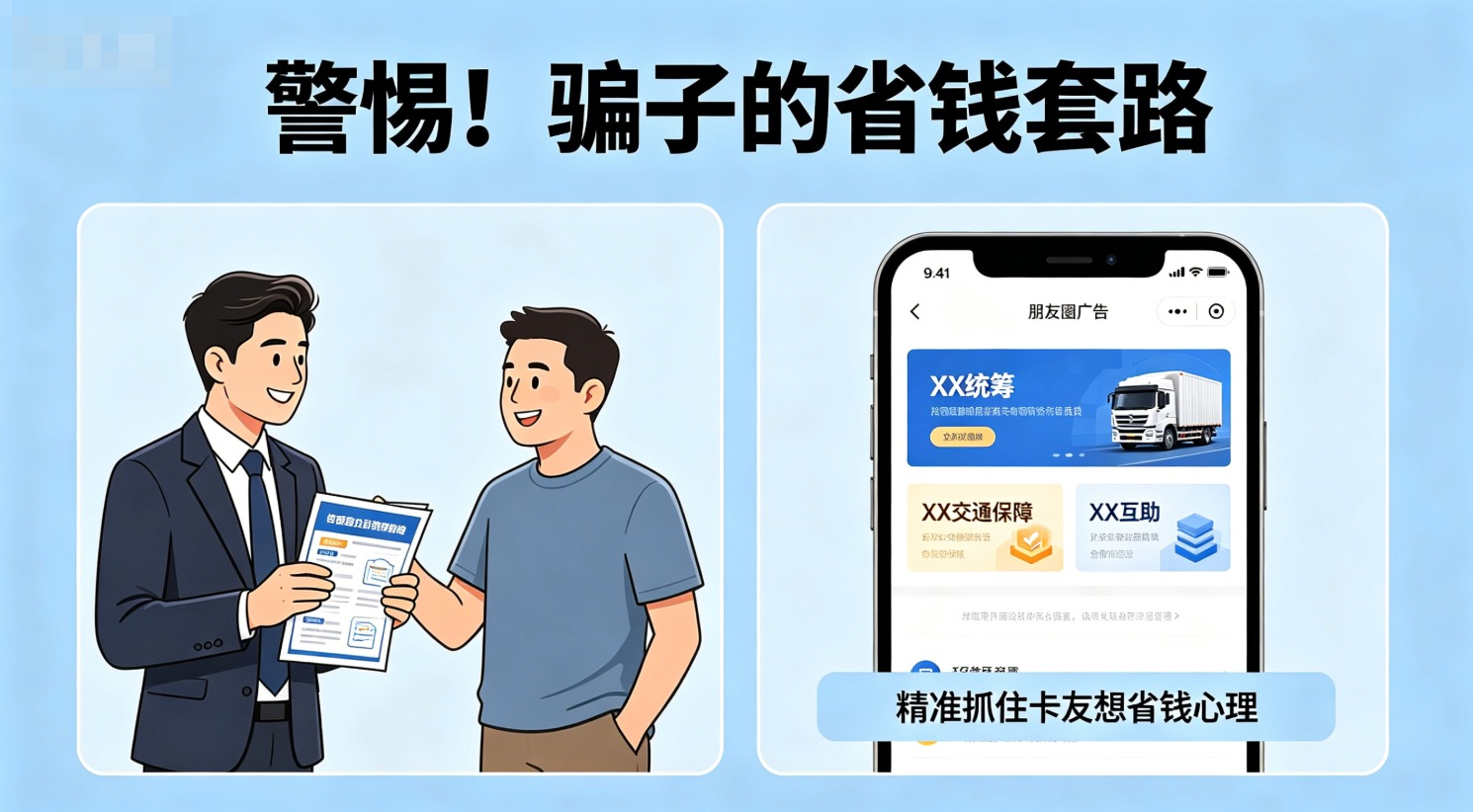 骗子的套路并不高明,他们精准地抓住了卡友们想省钱的心理。他们上门推销,或者在朋友圈发广告,推销一种叫XX统筹、XX交通保障、XX互助的产品。